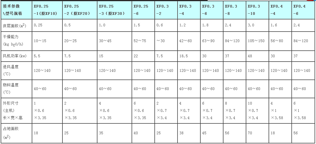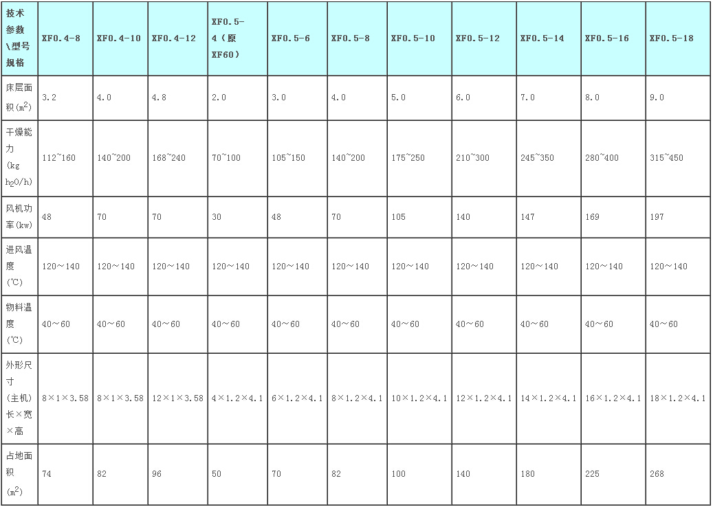 沸騰床干燥機可實行自動化生產,是連續式干燥設備。干燥速度快,溫度低,能保證產品質量,符合藥品生產GMP要求,蒸汽、電、熱風爐均可配用。技術參數:
