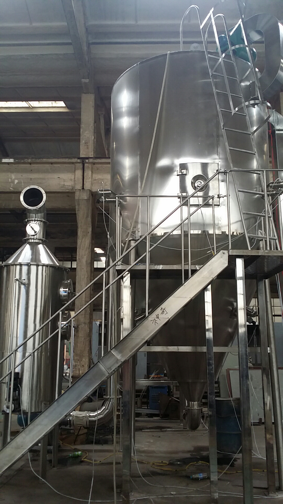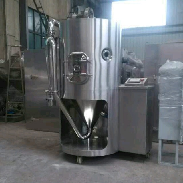 該機采用全封閉形式,所有部件均采用不銹鋼制造,配有三級凈化裝置,過濾后的空氣達十萬級要求 。簡體與頂部裝有冷壁裝置,使壁溫<80℃,物料在壁上停留也不焦化變質現象,大大增加了收粉率(達95%以上),而且不會產生混藥現象和粘壁現象。基本原理:中藥浸膏高速離心噴霧裝置是離心式噴霧干燥技術在特定物料干燥中的應用 ,也是利用高速離心式霧化器使物料分散成霧狀,與熱空氣所充分接觸 ,完成瞬間干燥,形成粉狀成品的干燥裝置。
