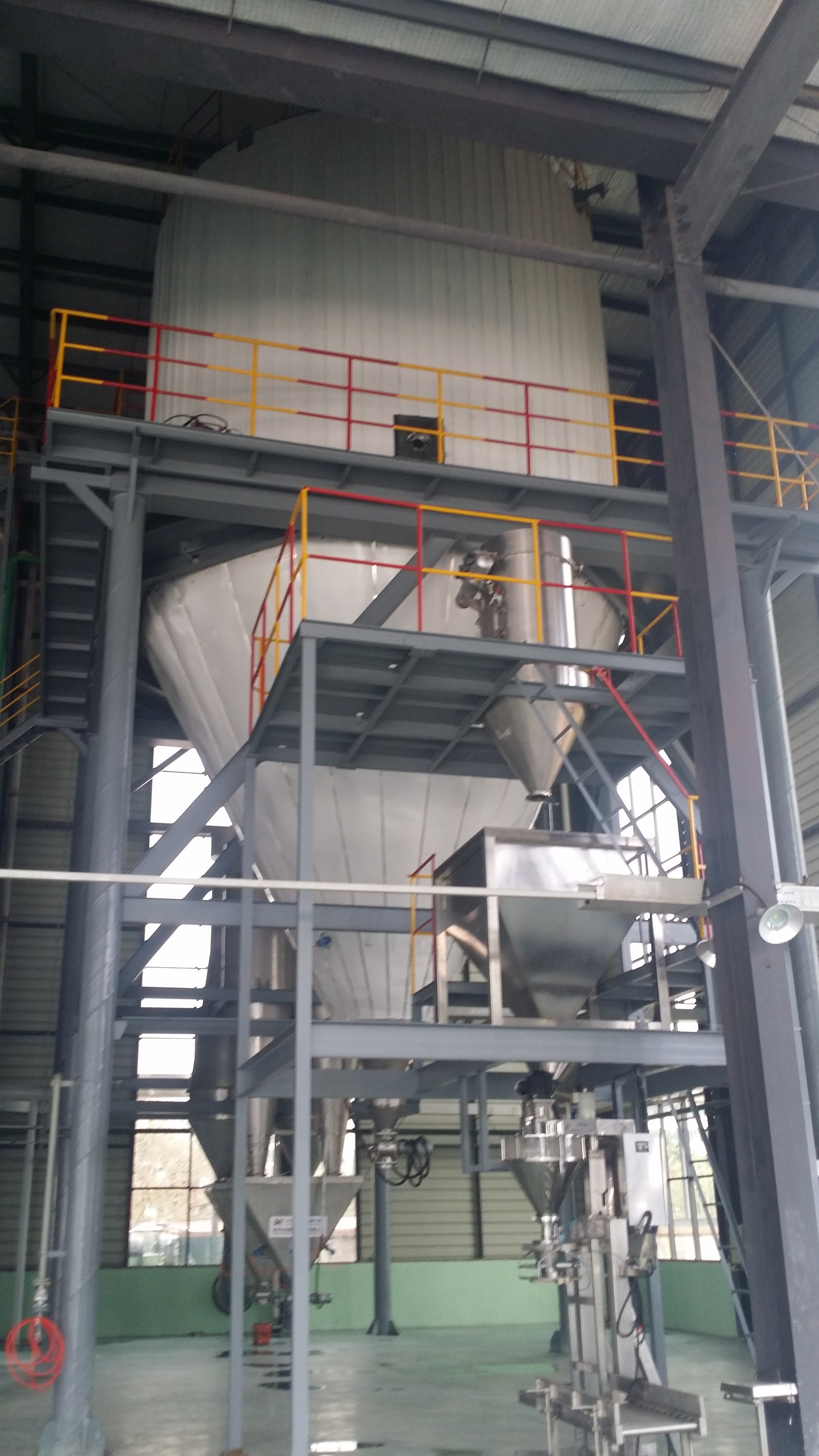 空氣經(jīng)過(guò)過(guò)濾和加熱,進(jìn)入干燥器頂部空氣分配器,熱空氣呈螺旋狀均勻地進(jìn)入干燥室。料液經(jīng)塔體頂部的高速離心霧化器,(旋轉(zhuǎn))噴霧成極細(xì)微的霧狀液珠,與熱空氣并流接觸,在極短的時(shí)間內(nèi)可干燥為成品。成品連續(xù)地由干燥塔底部和旋風(fēng)分離器中輸出,廢氣由風(fēng)機(jī)排空。特點(diǎn):
