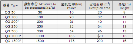 注:有*號者為二級干燥,裝機功率、占地面積以蒸汽加熱方式計算