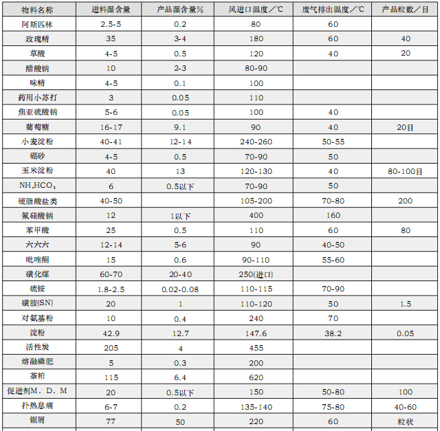 這種類型的設備,適應的物料比較多,除基本型提及的物料外,還有:安眠酮、A.B.C中間體、A.B.S樹脂、A.S.C、白碳黑、苯茶吡唑酮、茶粕、草酸催化劑、促進劑m、d.m、觸媒、沉淀炭粉、對乙酰氮基苯磺酰氨、對氨基水楊酸、哆耳瑪托、對苯二酸、二乙苯銨、二氧花鈦、活性碳、 氟硅酸鈉、氟石礦、副產硫銨、硅膠粉末、合成樹脂、 磺酸鈣、聚丙烯樹脂、金霉素、焦硅酸鈉、糠氯酸咖啡渣、口服葡萄糖、硫酸鈉、硫化礦、磷礦粉、蘭BB、 P.V.C、 熔融磷肥、四環素、三氧化鐵、碳酸鈣、鈦鐵礦、銅礦、土豆粉、尾煤、硬脂酸鹽、玉米蛋白、藥品、藥劑、氧化鐵、酒渣等。技術參數: