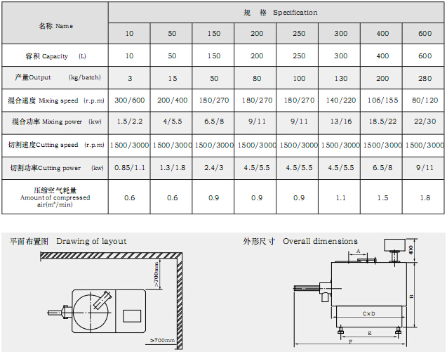 粉體物料與粘合劑在圓筒形容器中由底部混合槳充分混合成濕潤軟材,然后由側置的高速粉碎槳切割成均勻的濕顆粒。技術參數:
